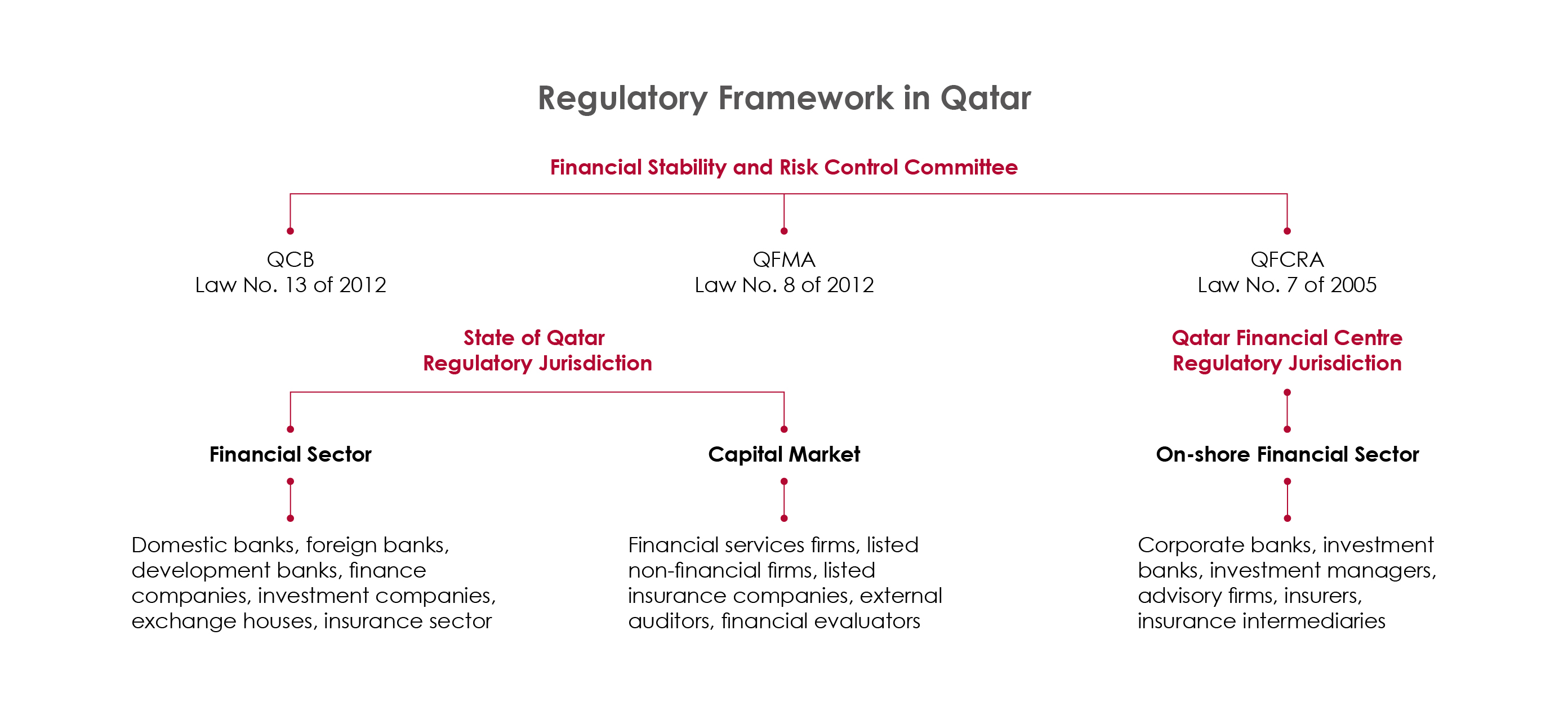 Qatar’s regulatory framework defines the regulatory jurisdictions of the Qatar Central Bank, the Qatar Financial Markets Authority, and the QFC Regulatory Authority.