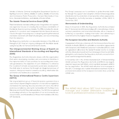 The International Organization of Securities Commis- In 2017, two Regulatory Authority staff were seconded to the NAMLC The Intergovernmental Working Group of Experts on an agreement will enable the Qatar Financial Centre to comply