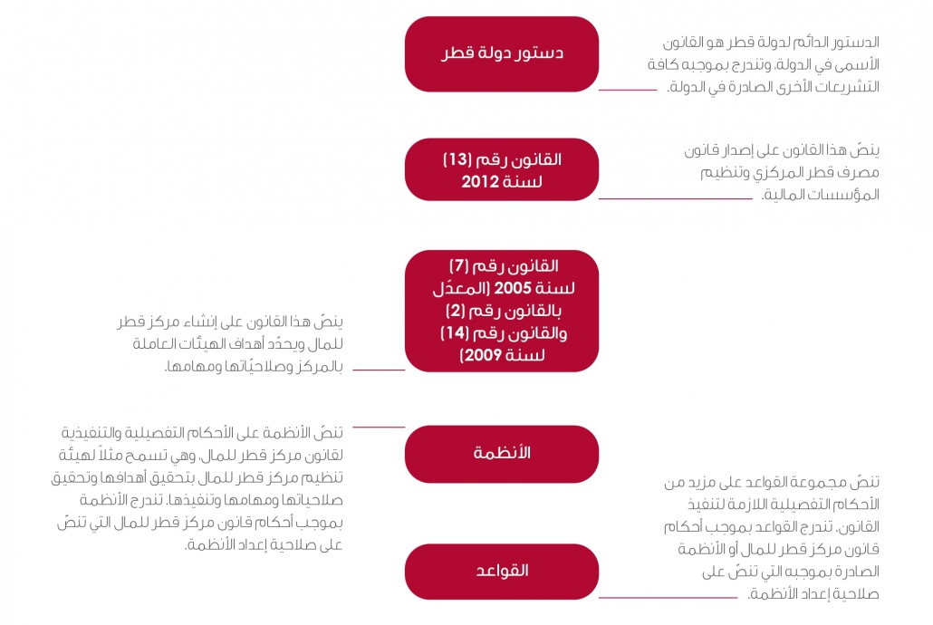 تشمل التشريعات عامةً مجموعة القوانين والأنظمة والقواعد المطبّقة في سياق محدّد. وفي مركز قطر للمال، تتكوّن التشريعات من الدستور القطري وقانون مصرف قطر المركزي وقانون مركز قطر للمال والقواعد والأنظمة الخاصة بهيئة مركز قطر للمال.